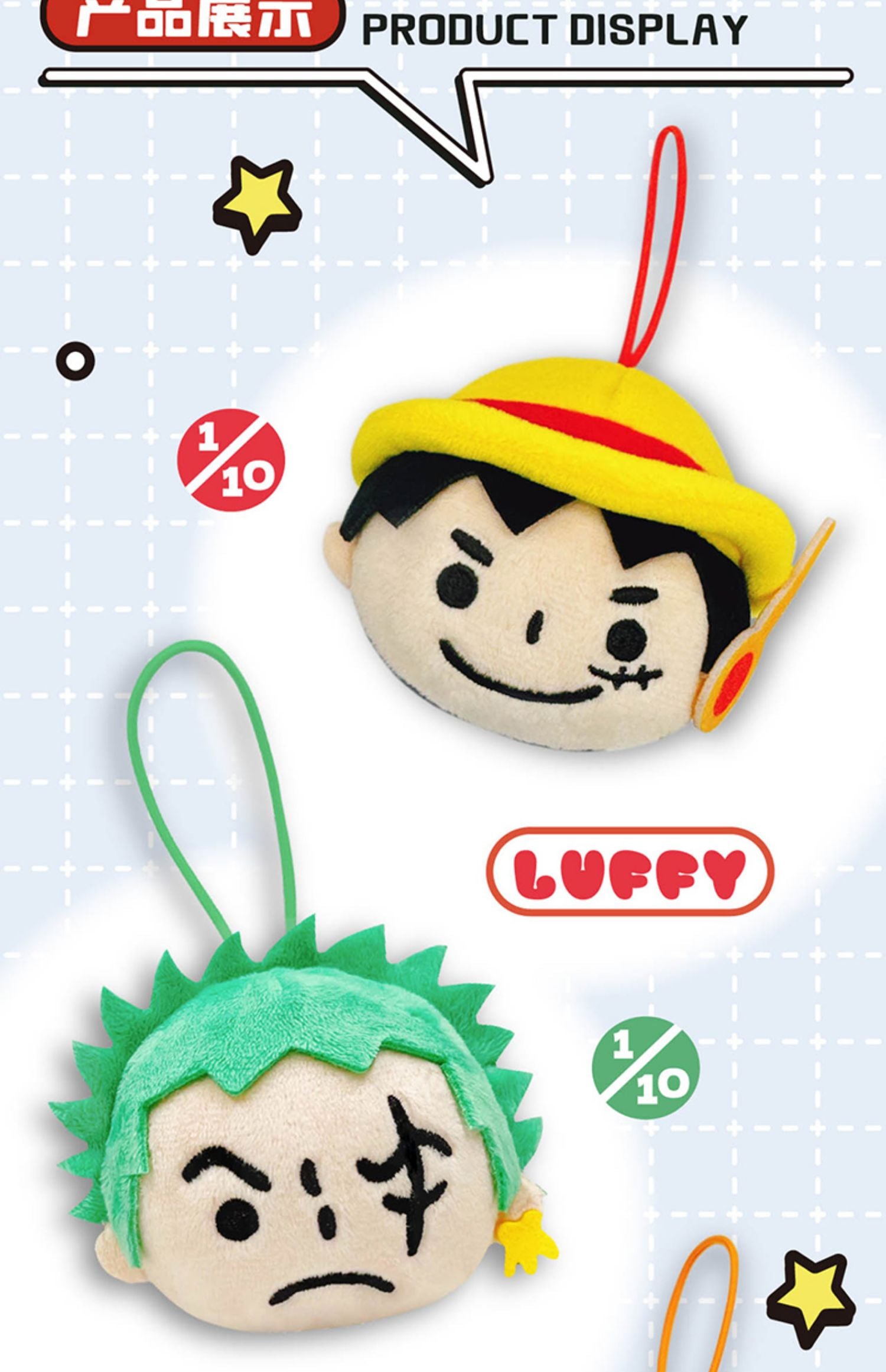 One Piece 海賊王毛絨糰子掛件。高度約 8cm,全套共 10 款。材質為聚酯纖維及 PP 棉,手感柔軟。