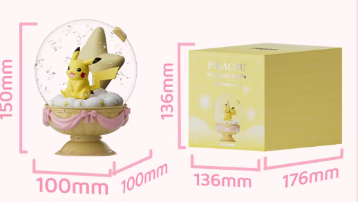 寶可夢系列水晶球,內含精緻角色造景。材質包含 PVC、玻璃及樹脂,內置電子元件。尺寸約 13.6x13.6x17.6cm。