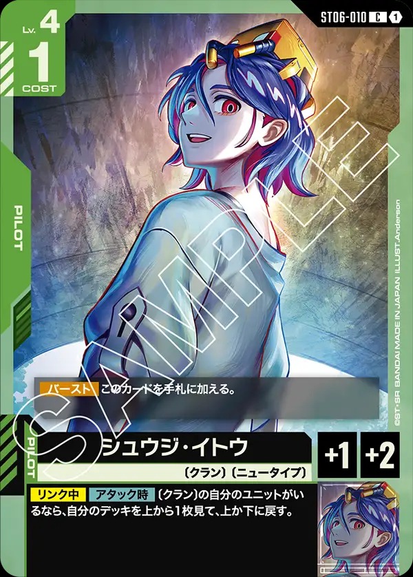 Lv. 4 COST 1 顏色 Green 卡牌類型 PILOT 【爆發】此卡牌加入手牌。 【共鳴中】【攻擊時】若我方戰鬥區存在〈戰團〉的機體,確認我方卡組最上方的1張卡牌,將其放回到卡組最上方或最下方。