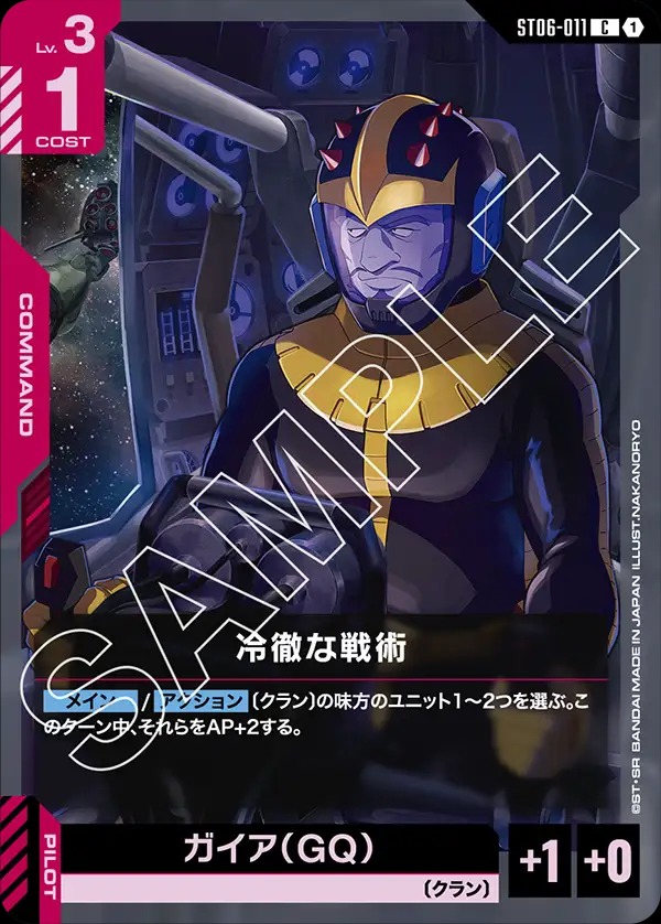 Lv. 3 COST 1 顏色 Red 卡牌類型 COMMAND 【主要】/【瞬動】選擇友方1~2張〈戰團〉的機體。本回合中,使其AP+2。 【機師】「蓋亞(GQ)」