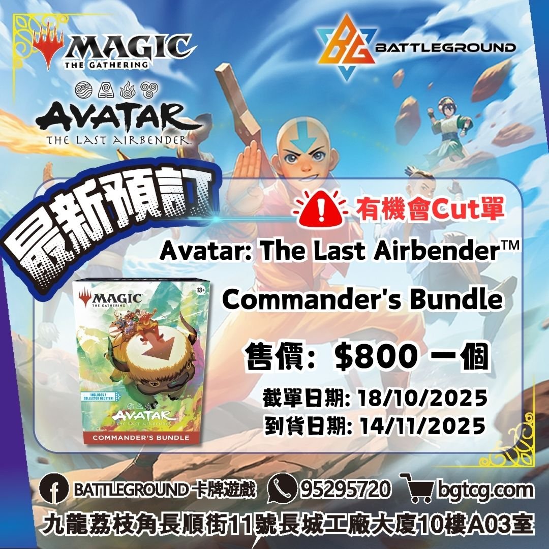 Contents: 2 of 10 Magic: The Gathering | Avatar: The Last Airbender Commander's Bundle Booster Fun cards 9 Magic: The Gathering | Avatar: The Last Airbender Play Boosters 1 Magic: The Gathering | Avatar: The Last Airbender Collector Booster Special Magic: The Gathering | Avatar: The Last Airbender versions of Sol Ring, Arcane Signet, and Swiftfoot Boots 5 traditional foil Appa lands 5 non-foil Appa lands 10 traditional foil basic lands 10 non-foil basic lands 1 Magic: The Gathering | Avatar: The Last Airbender click-wheel 1 card box *此商品有機會Cut單, 如果Cut單會安排退款