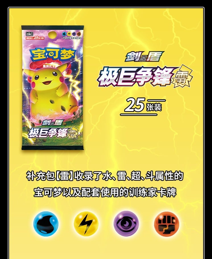 皮卡丘卡牌禮盒 皮卡丘卡牌展示框(1 件)(小跳蛙 & 敲音猴 & 泪眼蜥) 《VMAX 對決:雷鳴》補充包(25 張卡)– 1 包 《VMAX 攻防》強化包(6 張卡)– 1 包