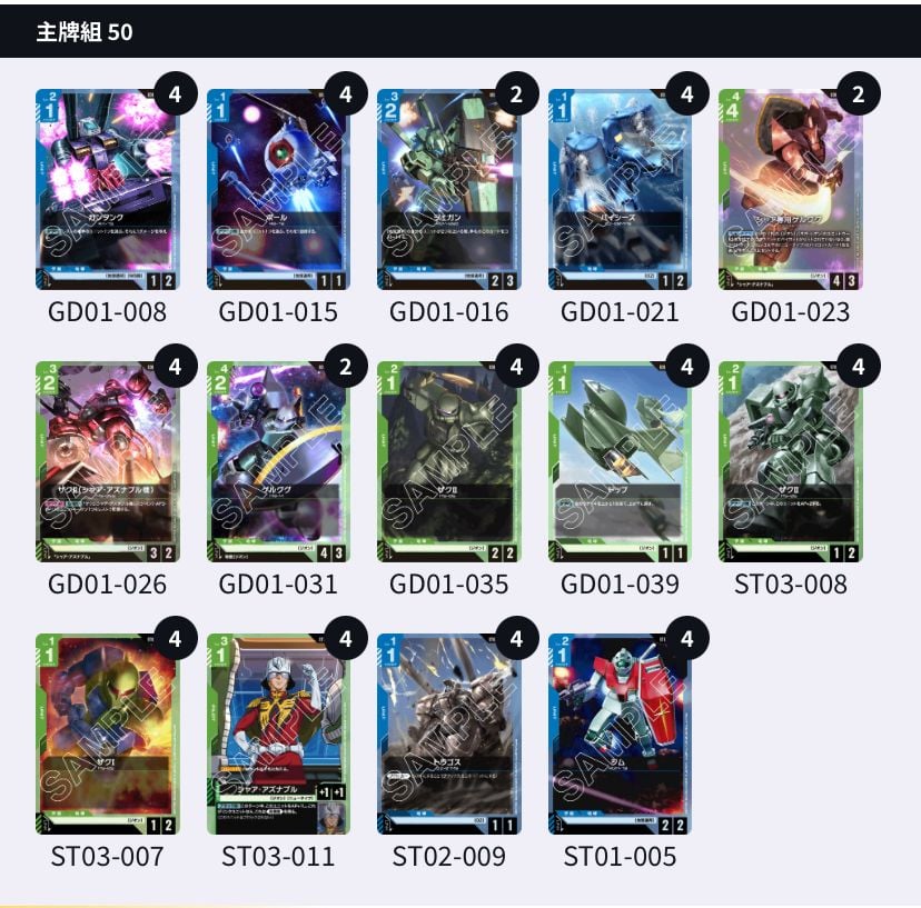 這副牌組是一個低費用的速攻牌組,專為追求快速勝利的玩家設計。牌組中的關鍵卡片如「ST01-005吉姆」和「GD01-035渣古II」以其低費用和高效率的特性,能迅速進場並對對手造成壓力。這種快速進攻的特性,使得玩家可以在對戰初期就主動出擊,掌控戰局。